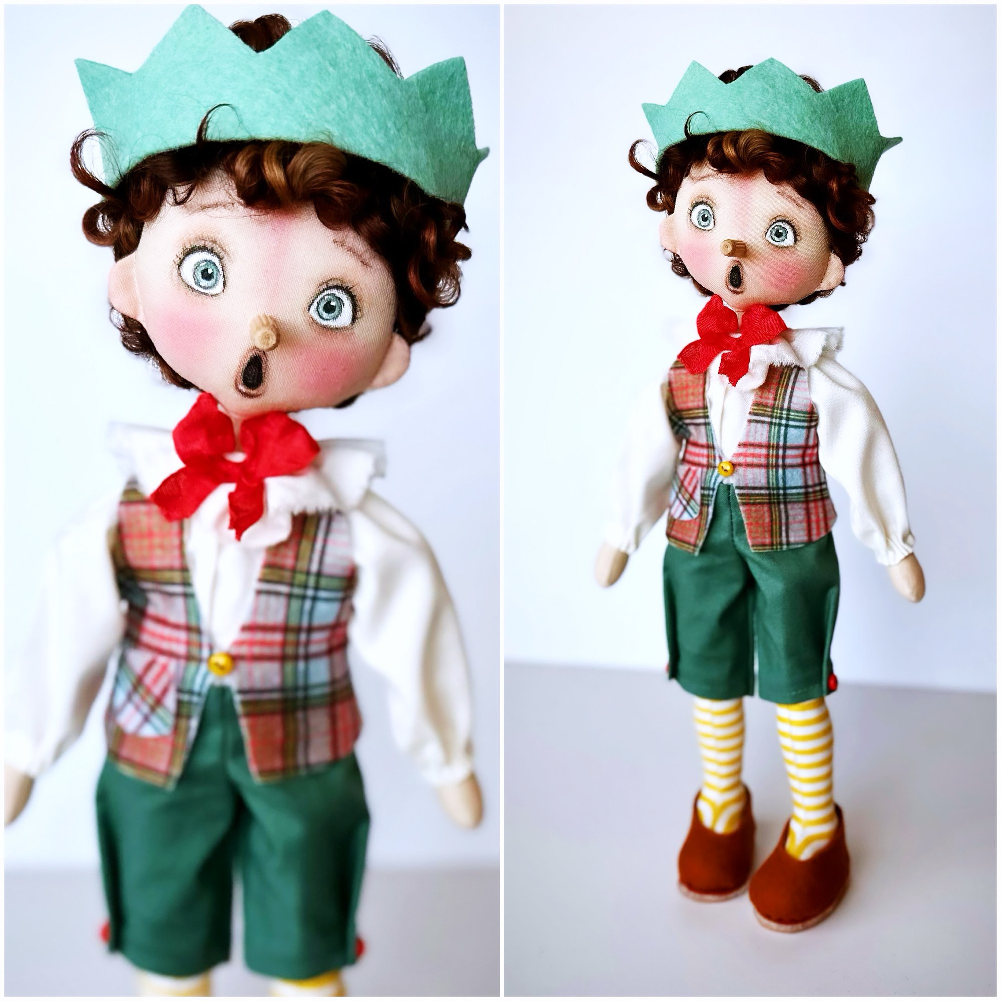 Facial features are hand drawn and then painted with acrylic paints and shaded with artist pencils. Each doll is unique and completely one of a kind. Measures approximately 12-13 inches from head to toe